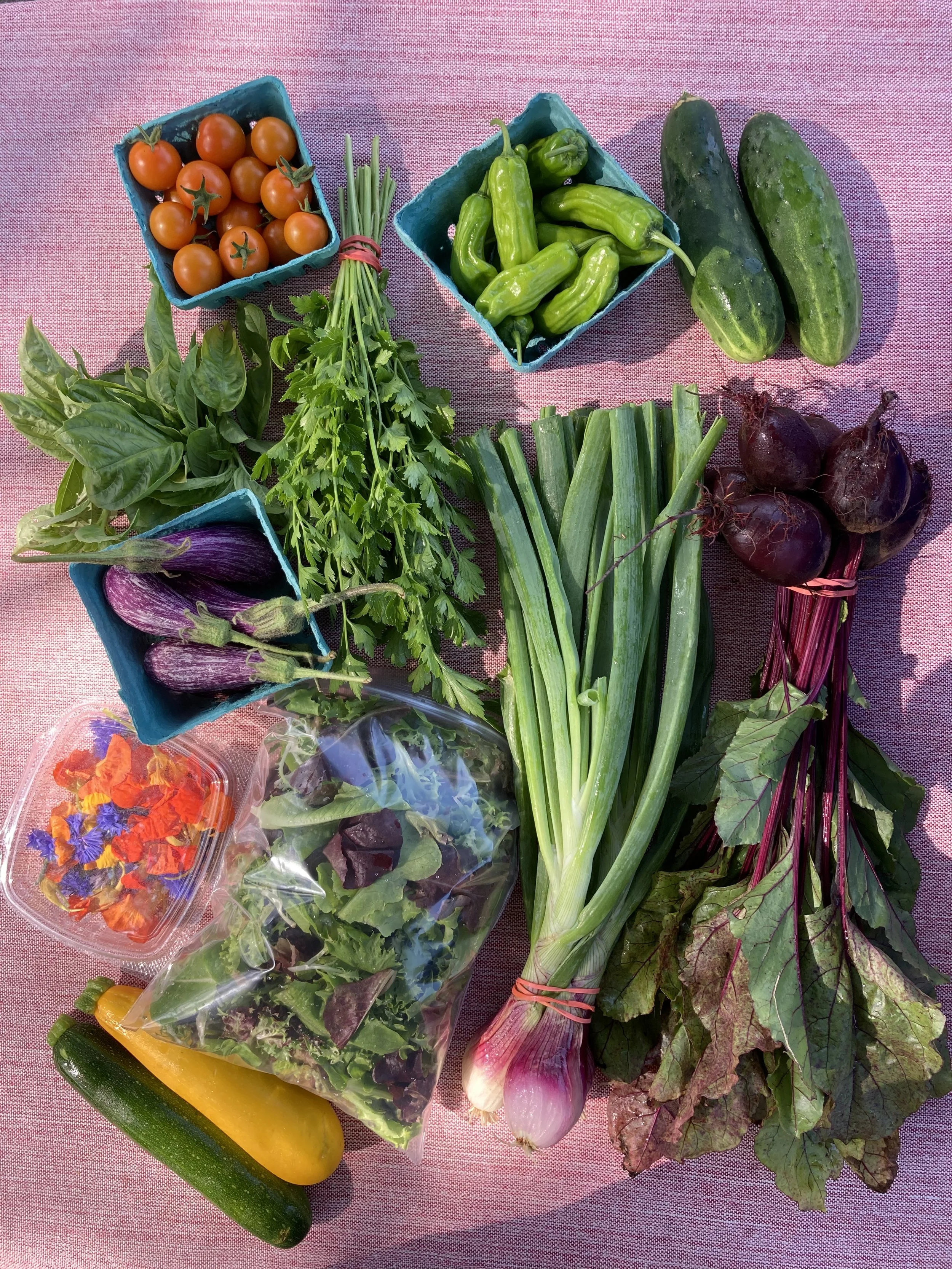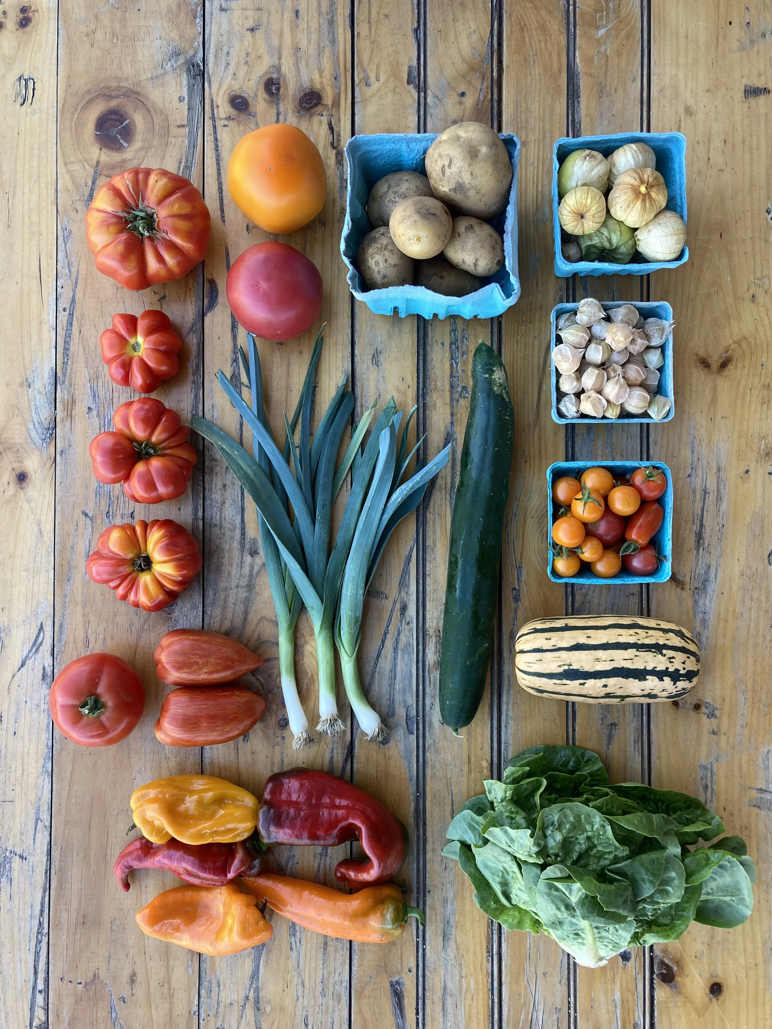 We grow over 60 varieties of vegetables, plus flowers and herbs on our 4 acre farm. We plan for a wide variety throughout the year, which shifts as different crops come in/out of their peak seasons. You can expect to see several options for greens every week, an allium, a root, plus seasonal specialties like sugar snap peas, tomatoes, peppers, and squash as each crop comes into its own harvest season.